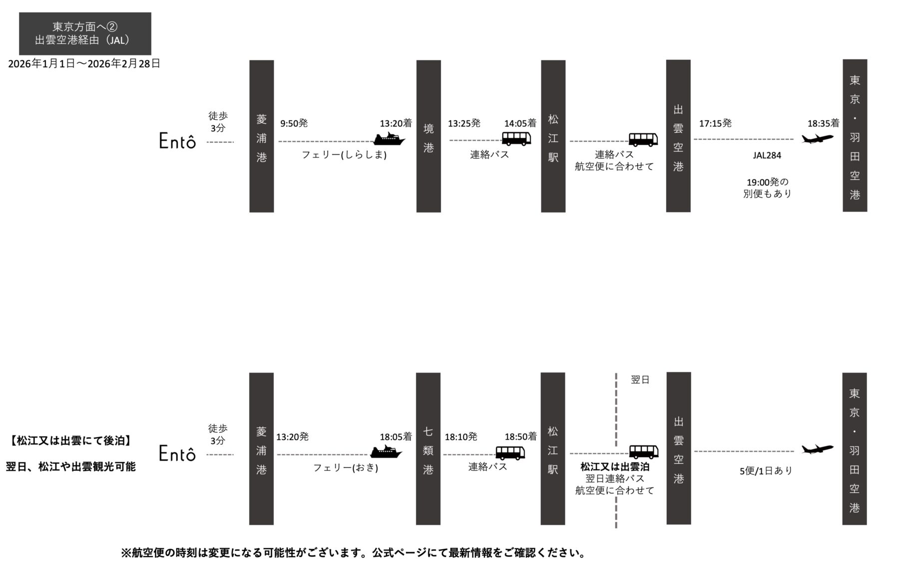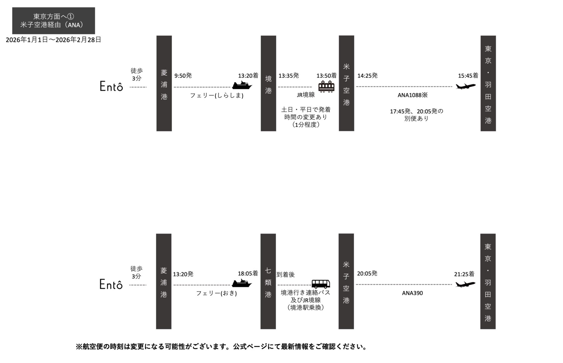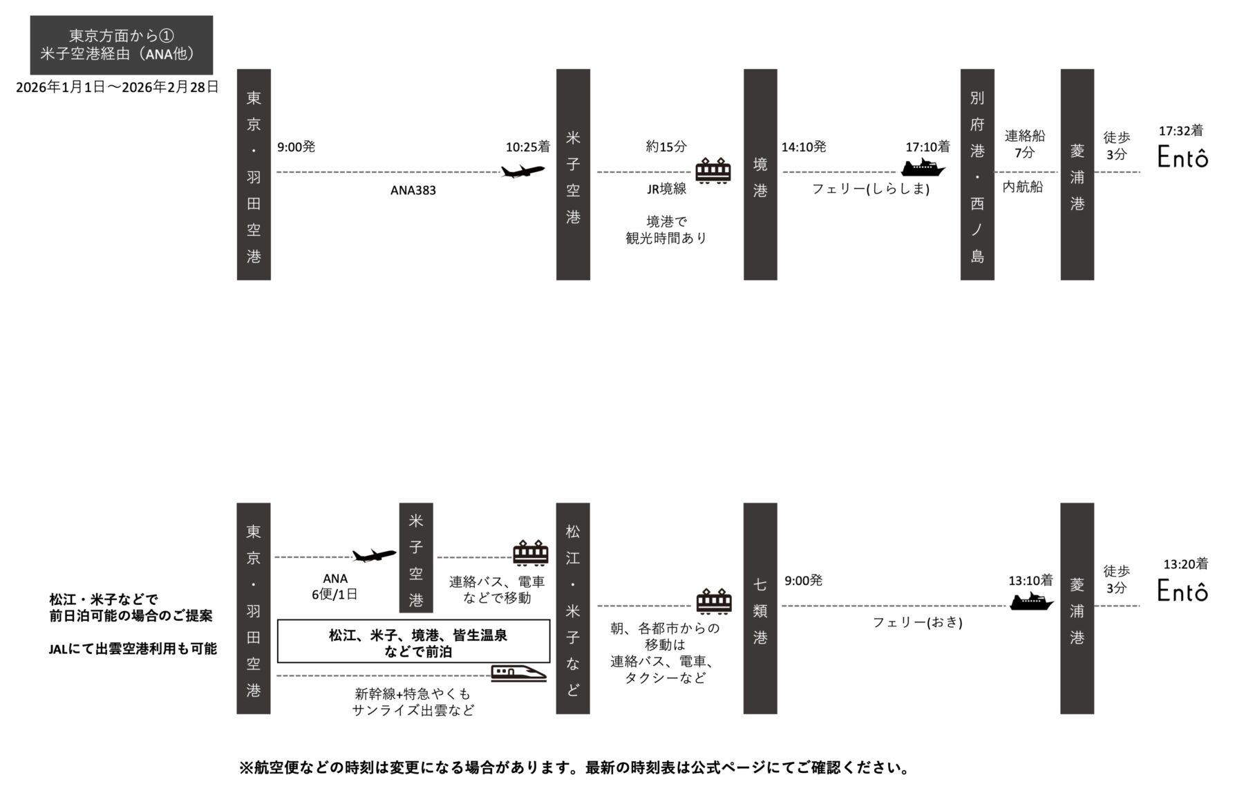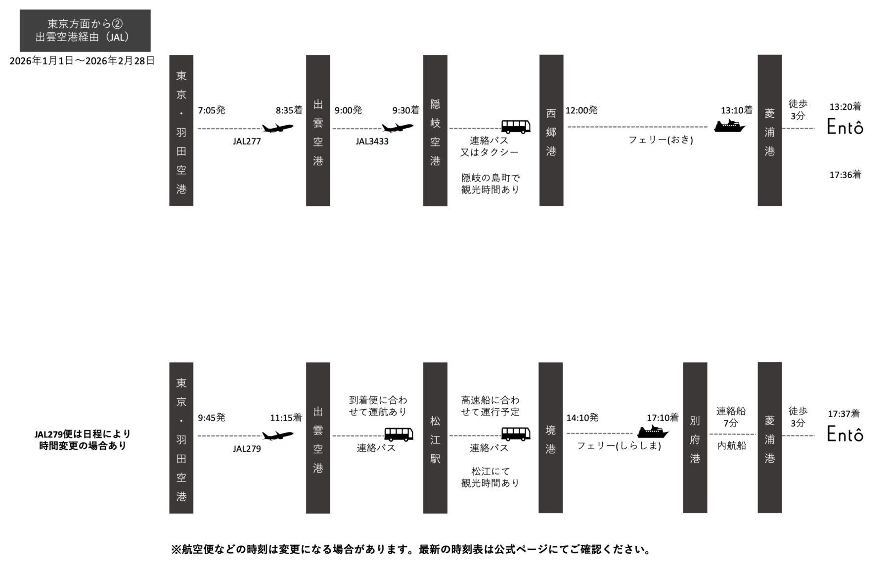 東京方面からのアクセス例をご案内いたします。(2月28日まで) 1月1日〜2月28日の東京方面からの往復アクセス例をご案内いたします。 期間により高速船や飛行機のお時間が変わります。 他の日程はこちら: