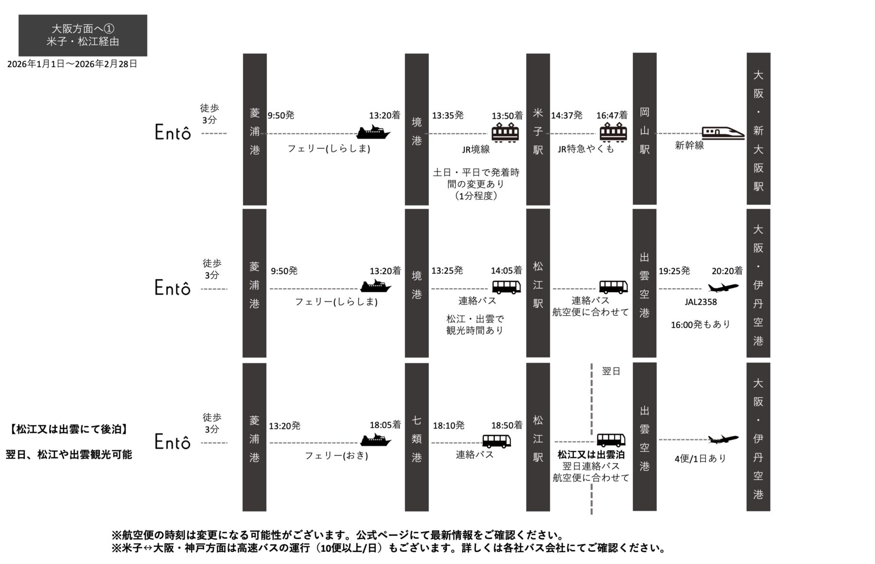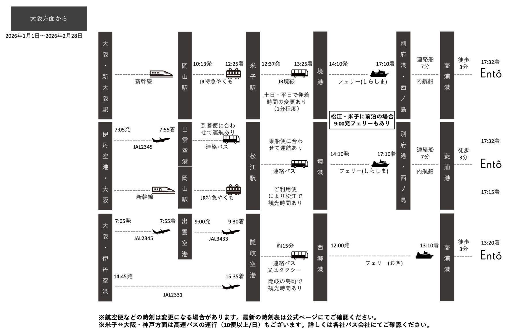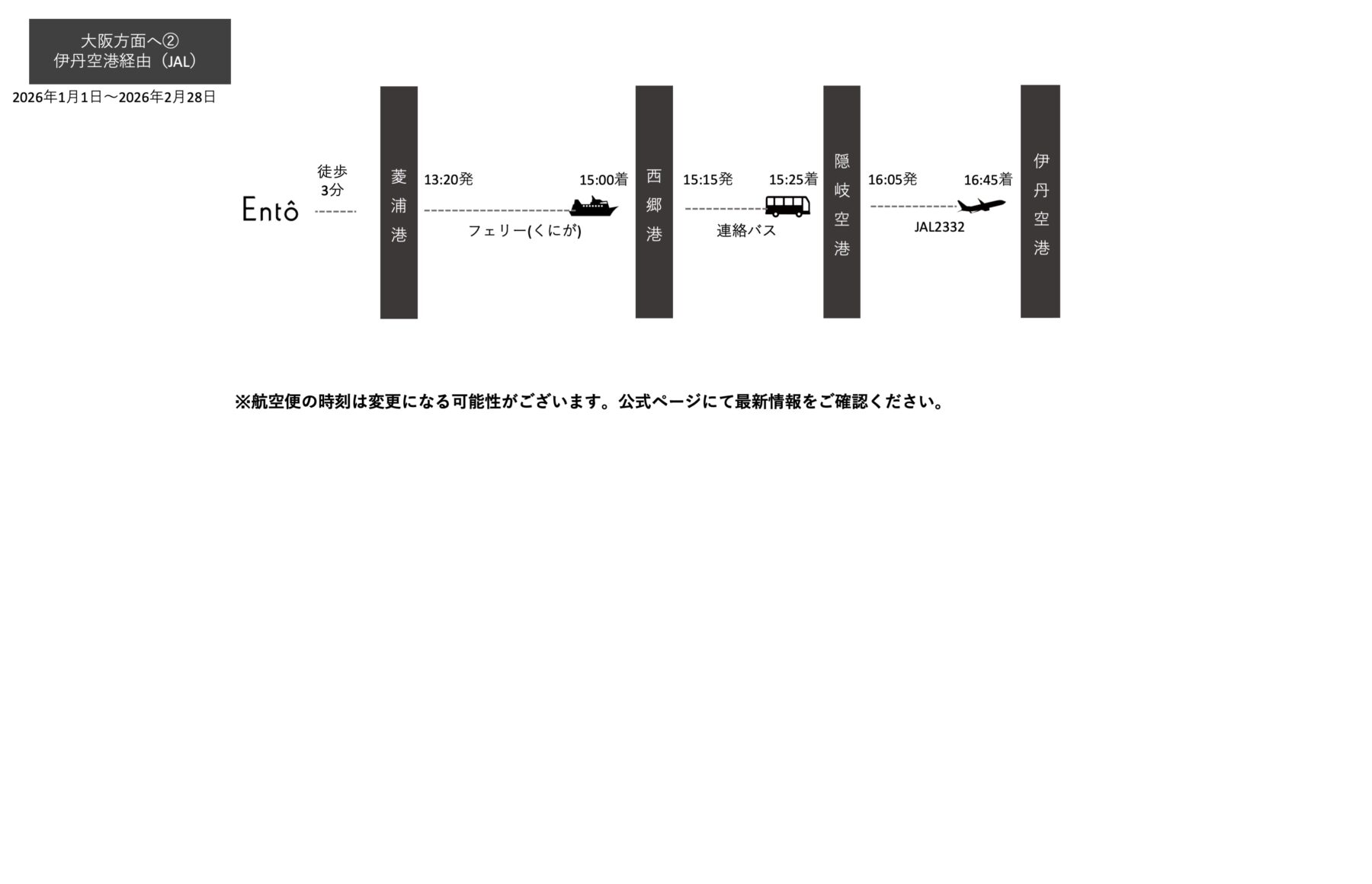 大阪方面からのアクセス例をご案内いたします。(2月28日まで) 1月1日〜2月28日の大阪方面からの往復アクセス例をご案内いたします。 期間により高速船や飛行機のお時間が変わります。 他の日程はこちら: