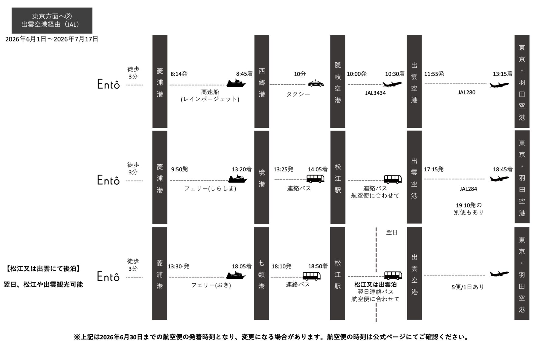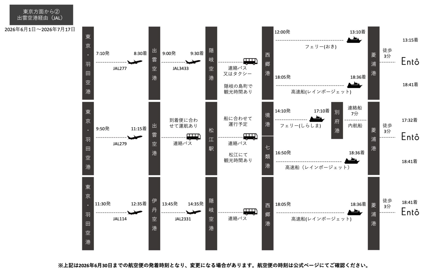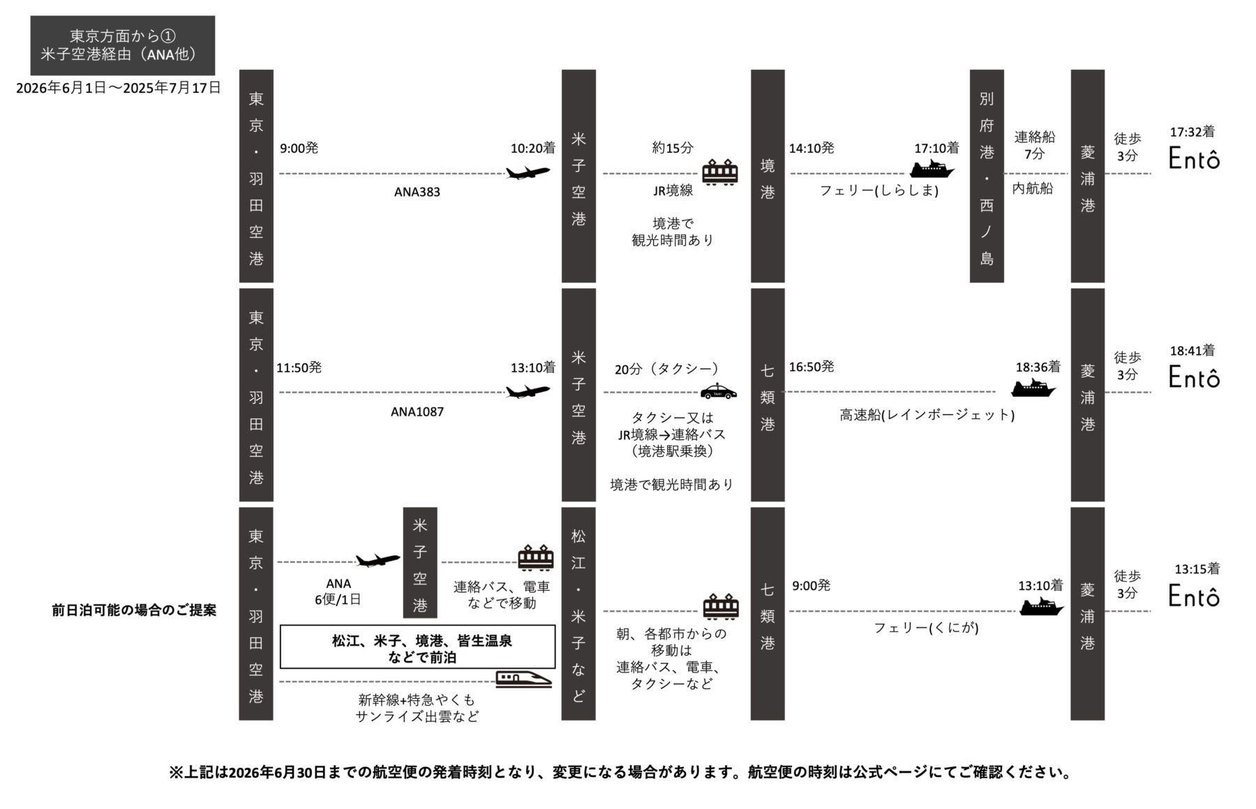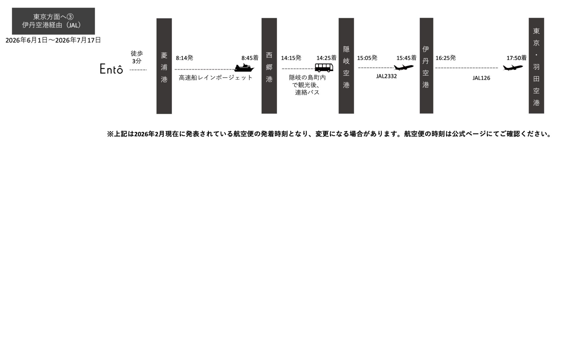 こちらは2026年6月1日〜7月17日までの東京方面からのアクセス例となります。 期間により高速船や飛行機のお時間が変わります。ご利用日に合わせてご確認ください。 ※ご案内の時刻は交通機関各社の事情により、変更、運休の場合がございます。 他の日程はこちら:
